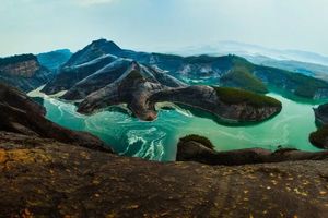 高椅岭的山就像一条条巨大的海豚,而水却像一块块形状各异的碧玉。足之所至,目之所及无不给人视觉盛宴。高椅岭虽然也属于丹霞地貌,但她并不像其他地方那样具有高耸的山峰,陡峭的石林,而让人兴叹生畏,可望不可及。她的一切都是圆润亲和的。一条条低低矮矮圆弧状错落有致的山岭,围绕着一汪汪清澈的湖水,一片丹霞赤石之中,树石相间、犬牙交错、山环水绕、山水相融。